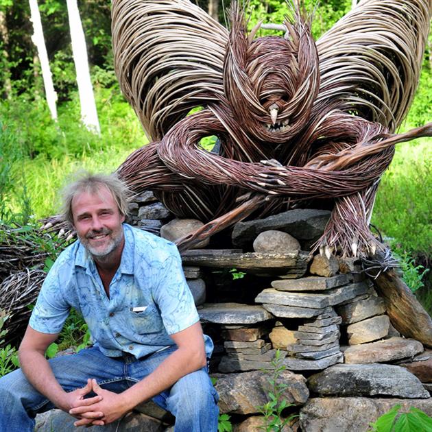 A landscaper by trade, Sowrey’s experience with loose stone stacking naturally progressed into stick weaving. The first spark of inspiration happened about 15 years ago while he was making a fence to keep deer out of his yard. Before he knew it, the weave started to emerge as he experimented with different ways of structuring it and filling it. What began as function also became art.